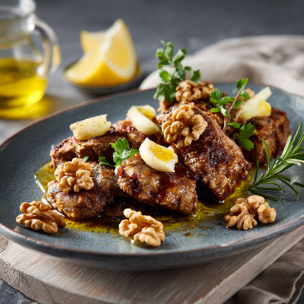Rich Albanian meat dish with walnuts, butter, and garlic, featuring tender cubed meat
