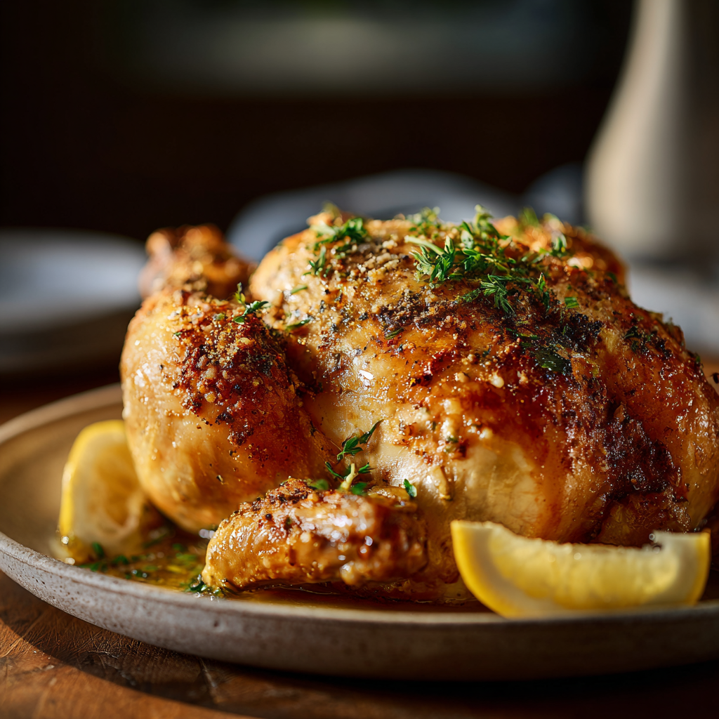 Roasted whole chicken with 40 cloves of garlic and aromatic herbs